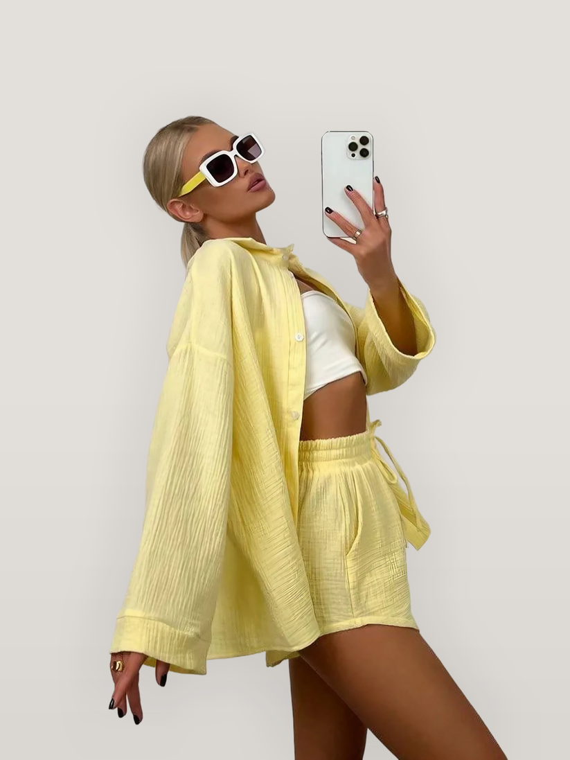 SET CASUAL CON CAMISA LARGA Y PANTALONES CORTOS PARA UN MIRA RELAJADO Y MODERNO