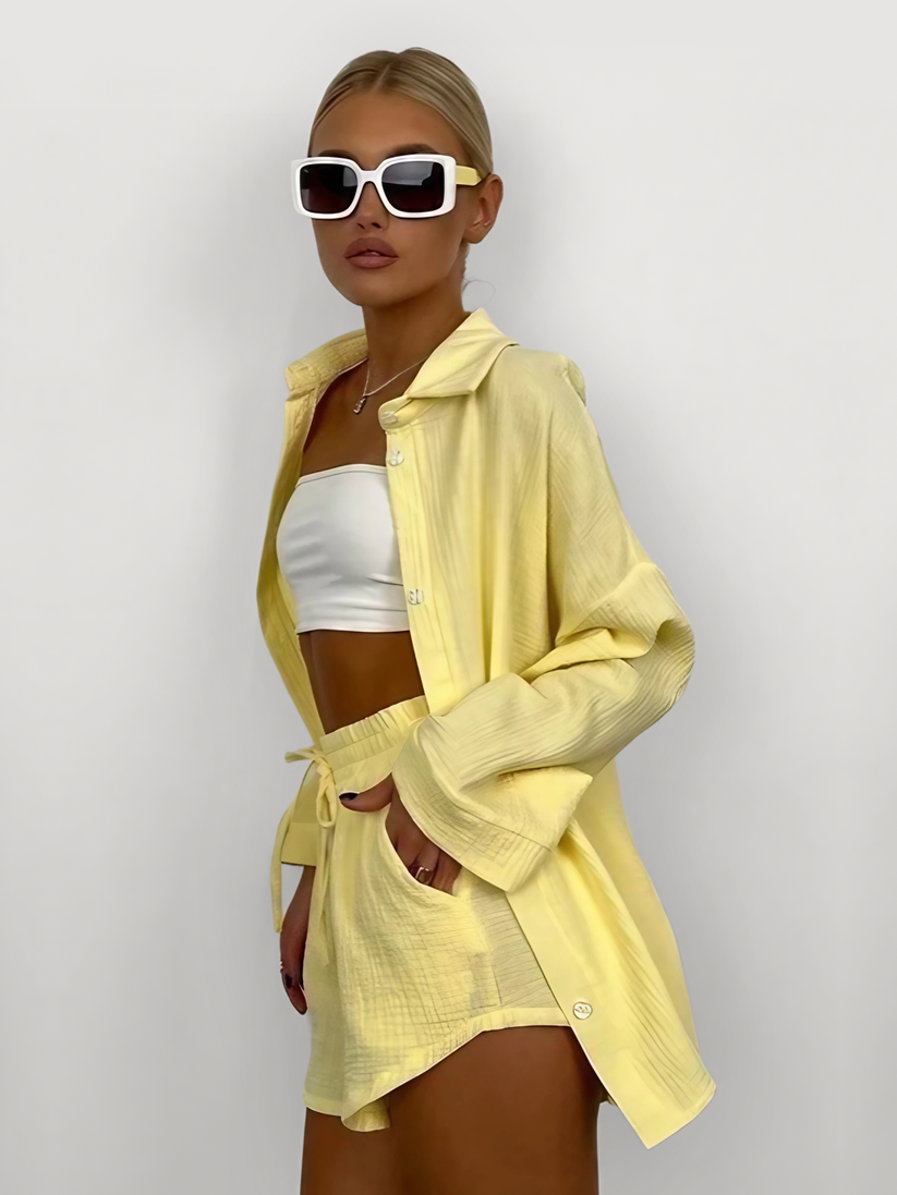 Conjunto casual con camisa de manga larga abotonada y pantalones cortos modernos