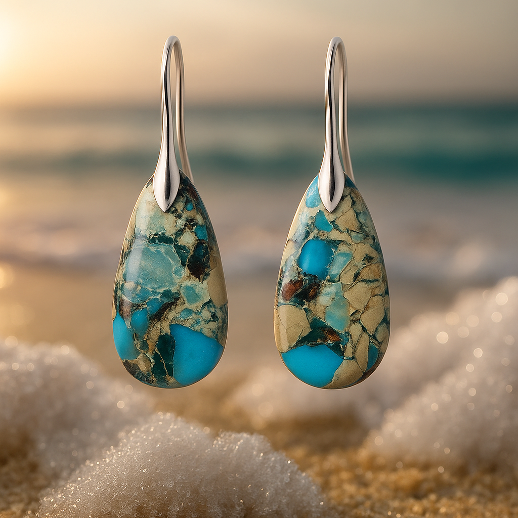 Die Ohrringe Orelia sind inspiriert von der atemberaubenden Schönheit des Big Sur, wo die rauen Felsen auf das tiefblaue Meer treffen. Die türkisen Steine harmonieren perfekt mit den goldenen Beigetönen der Meerschaum-küsten, und schaffen eine Komposition, die an Dschungellandschaften und pure Freiheit erinnert.